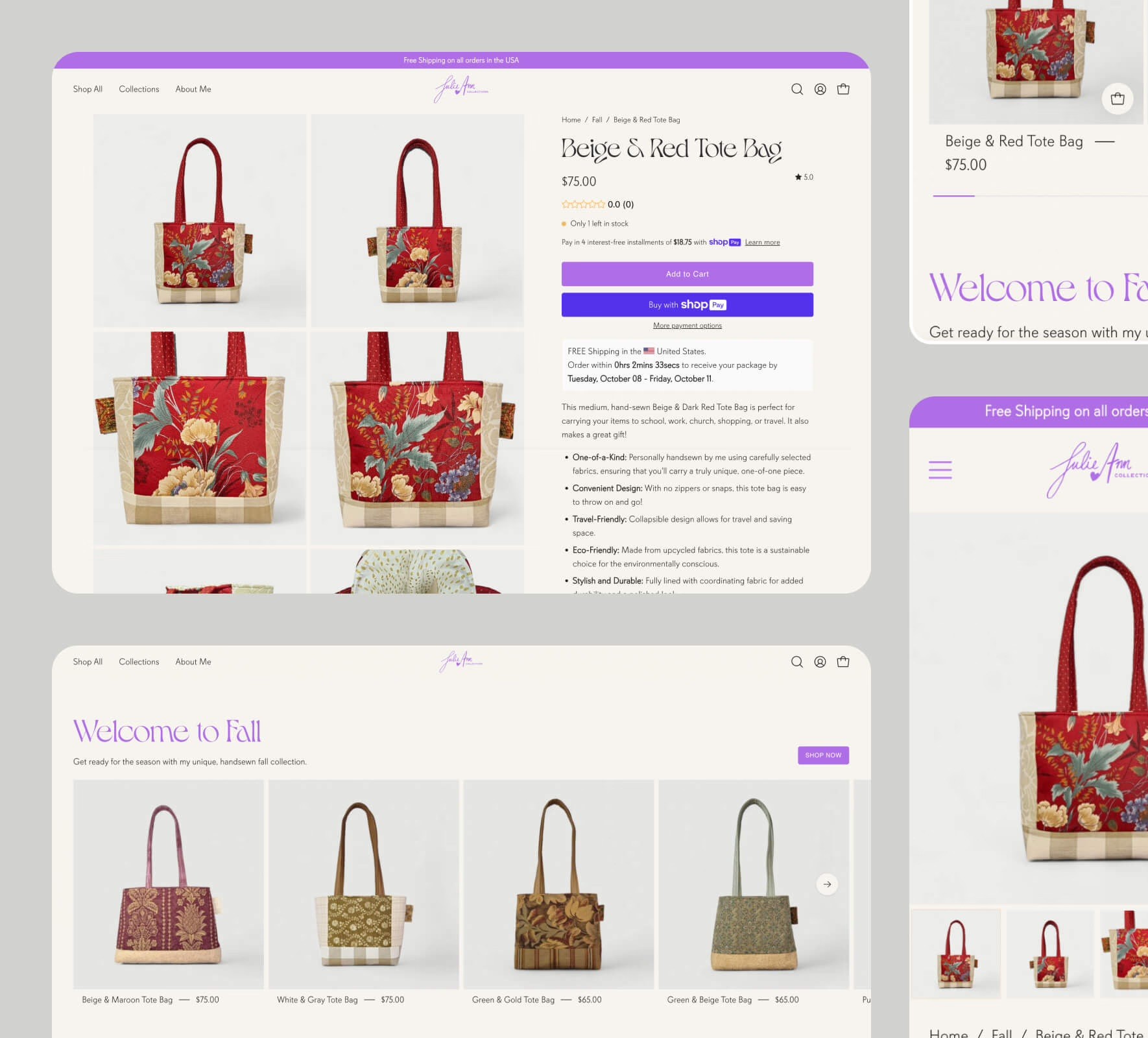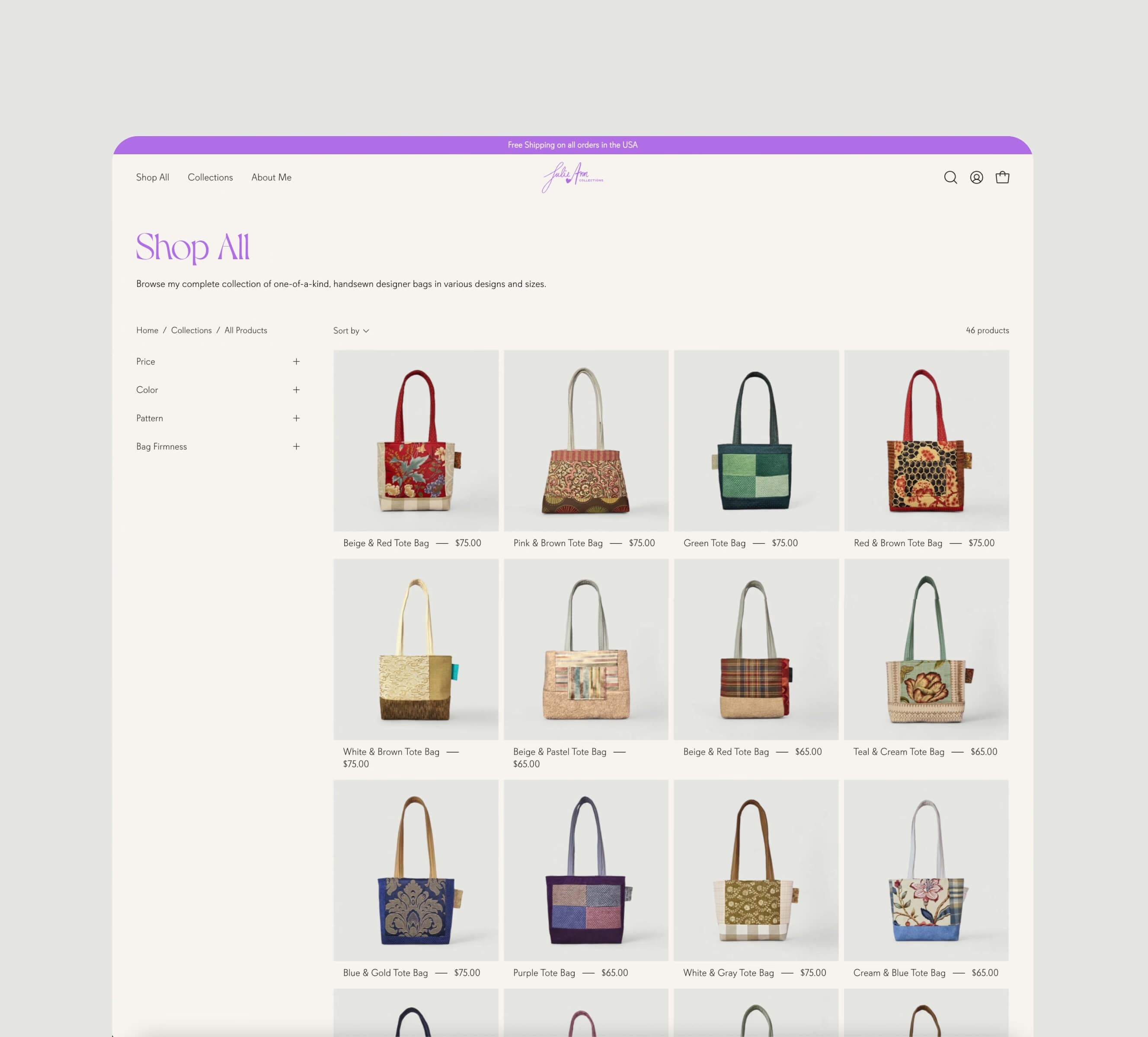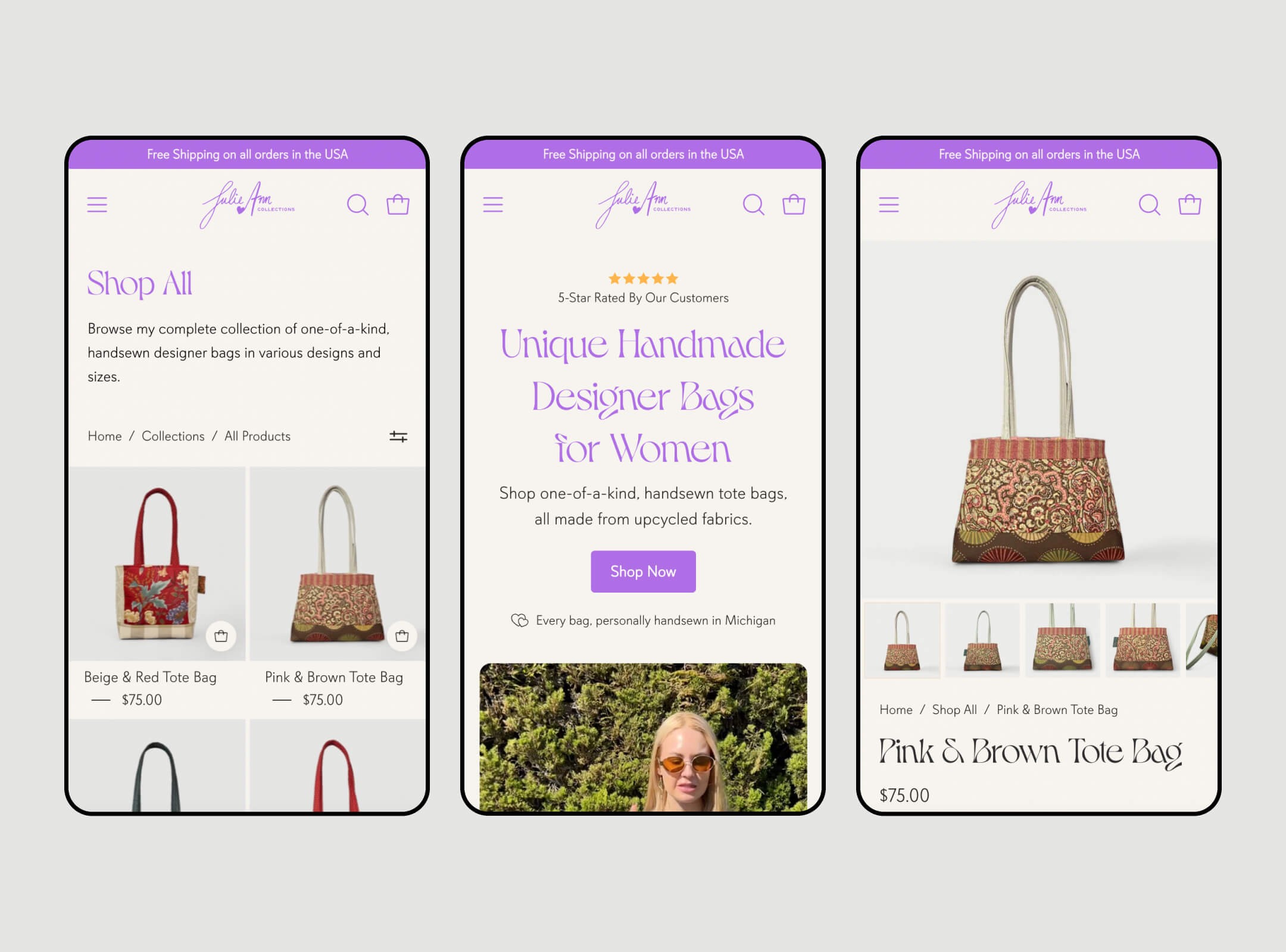 Julie Ann Collections is an eCommerce brand that sells handmade designer bags made from upcycled fabrics.